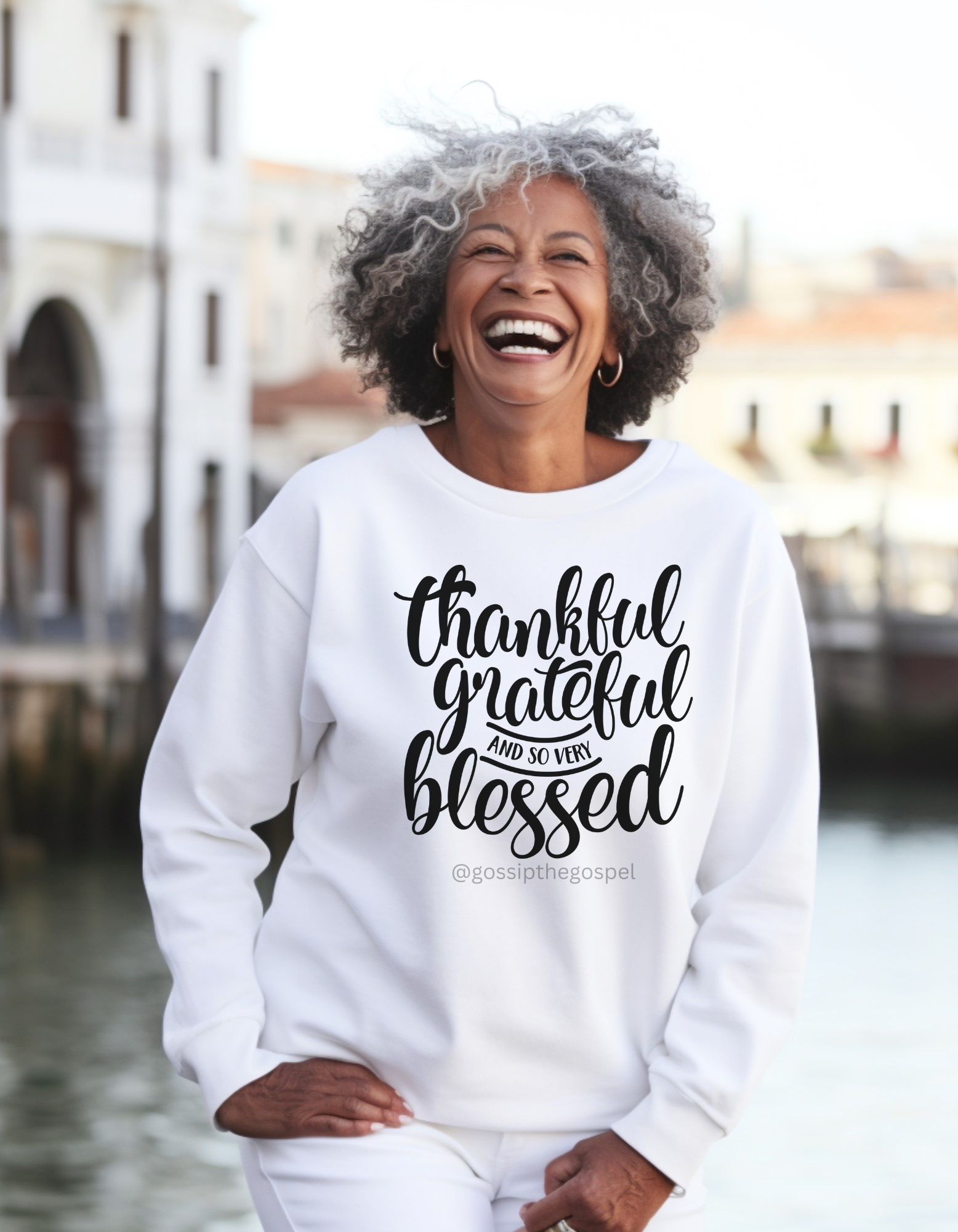 Our Thankful, Grateful and So Very Blessed white crew neck sweater will put a smile on your face and spread joy to everyone around you! Enjoy a super comfortable and luxurious poly-cotton blend, and don't forget to thank the Lord! Blessings abound.☺️